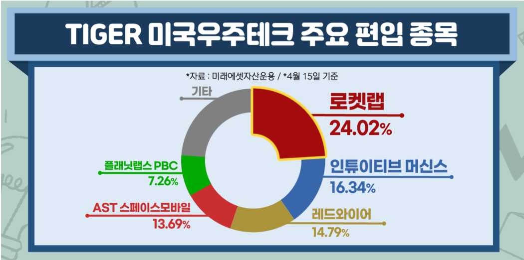 그 외에도 저희가 조금 더 주목하고 있는 종목 같은 경우에는 레드와이어라는 종목이 있는데요. 레드와이어 같은 경우에는 저희 ETF에서도 AST 스페이스모바일과 비슷한 수준의 비중으로 편입이 돼 있는데 레드와이어는 어찌 보면 우주에서 태양광 패널이라든지 이렇게 부품을 위주로 영위하는 사업이고, 그래서 레드와이어 같은 경우에는 글로벌 우주 시장이 커질 때 수혜를 받을 수 있는 그런 종목으로 저희는 보고 있습니다.