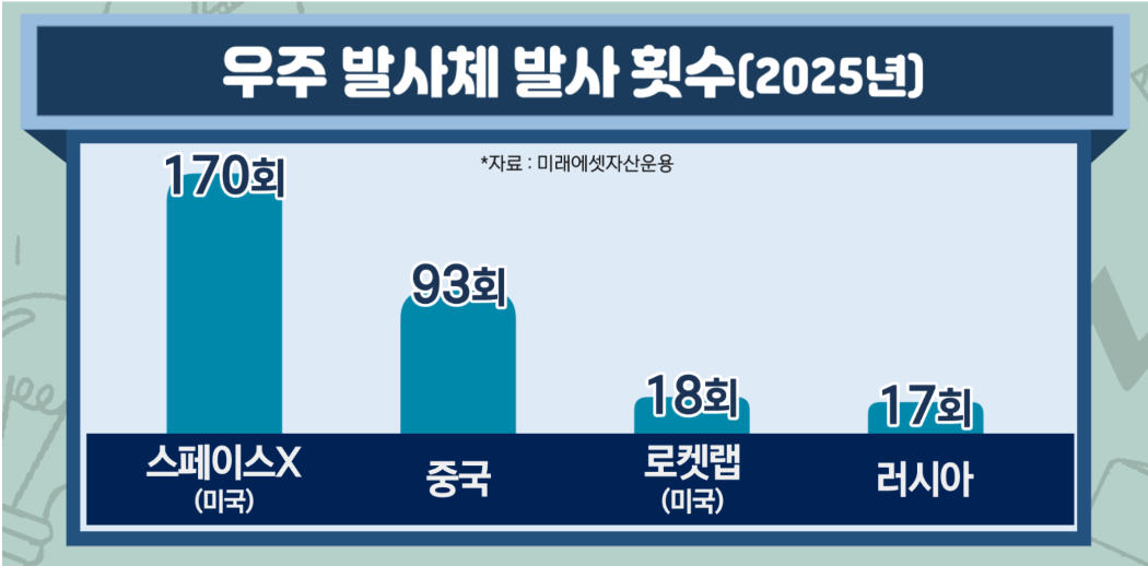 그래서 작년만 해도 우주 발사체 횟수만 비교를 해보자면 경쟁국인 러시아나 중국 같은 경우 러시아 같은 경우는 17회밖에 발사를 안 했고, 중국 같은 경우는 97회밖에 발사를 안 했는데 미국에서 스페이스X만 작년에 170회를 발사를 하면서 상당히 그런 큰 혜자를 구축을 하고 있어가지고 미국 우주가 현재로서는 아예 우월하고 압도적인 그런 입지를 구축을 하고 있다, 이렇게 생각을 해가지고 저희 TIGER ETF에서도 미국 우주를 중점적으로 미국 우주만 투자를 하는 ETF를 이번에 상장을 시켰습니다.