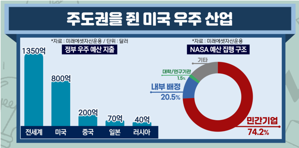 그렇기 때문에 앞으로도 미국 정부도 적극적으로 지원을 해주고 있고 민간 기업들도 많이 생기고 있어가지고 미국 우주 산업은 앞으로 커질 수밖에 없는 산업인데 이 산업 자체에 집중하는 게 좋을 것 같고 특히 미국 우주 같은 경우에는 개별 종목에 투자하는 게 어찌 보면 위험도가 좀 더 높을 수 있습니다.