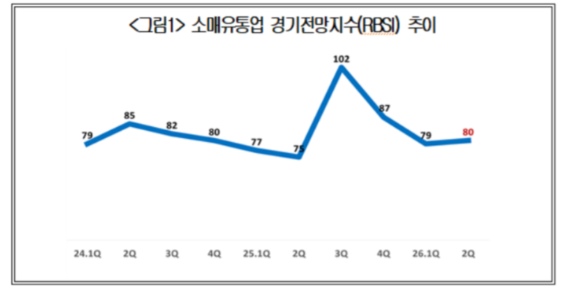 대한상공회의소(회장 최태원)가 소매유통업체 500개사를 조사한 2026년 2분기 소매유통업 경기전망지수(RBSI)는, 80을 기록했다.