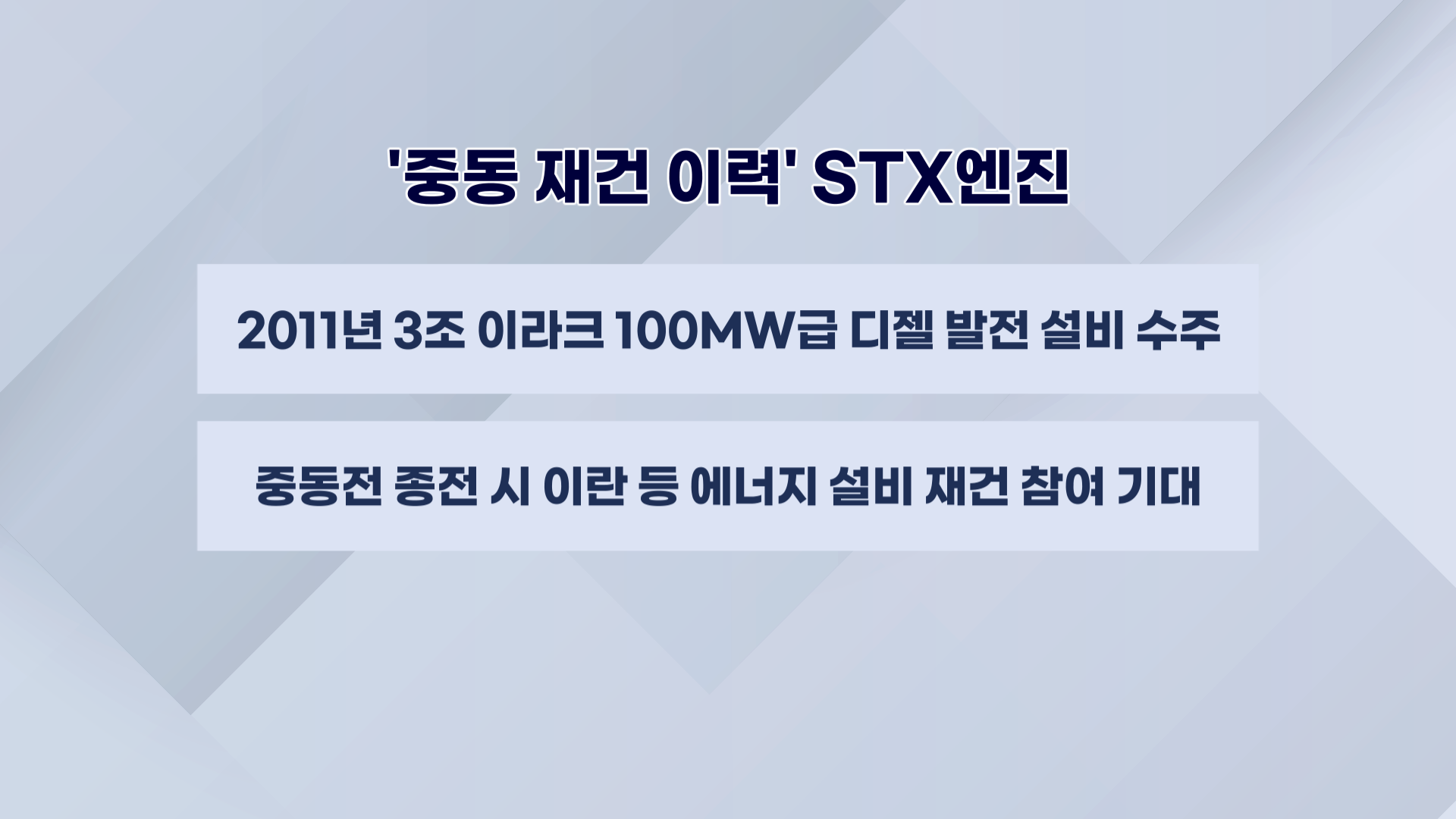 STX엔진 등 STX 계열과 이라크 전력부는 지난 2011년 100MW급 디젤 발전 설비 25기 수주 계약을 맺었습니다.