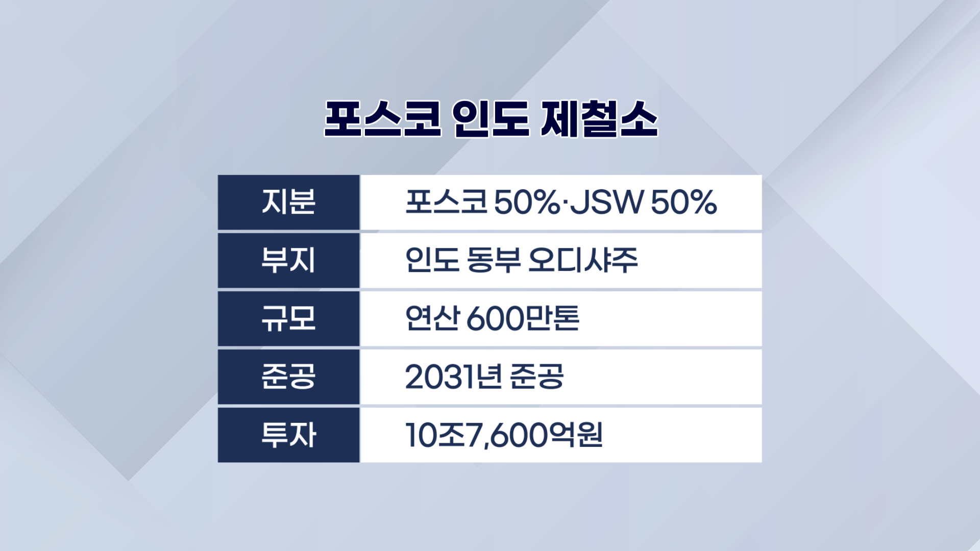 포스코는 인도에서 현지 1위 철강사인 JSW그룹과 연산 600만톤의 일관제철소를 건설할 계획인데요.