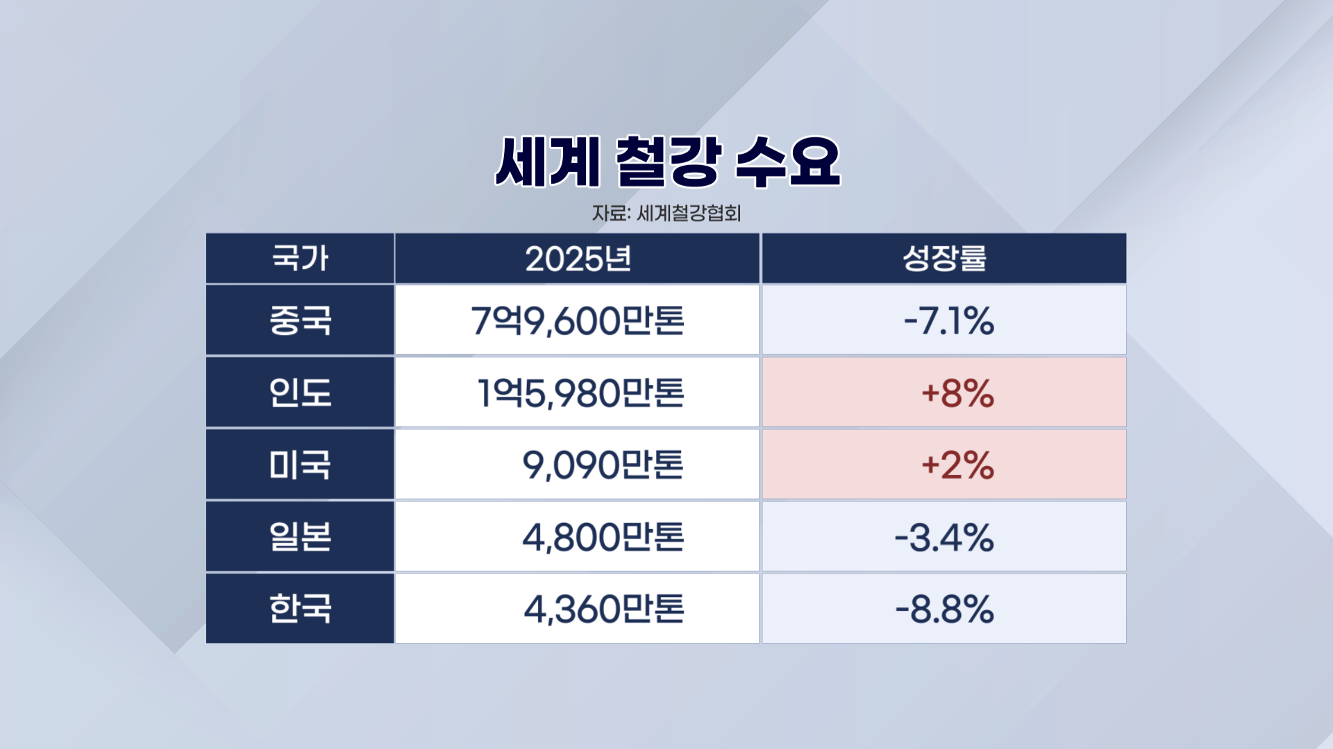 철강 수요 상위 5위권 국가 중에 플러스 성장률은 인도와 미국이 전부입니다.