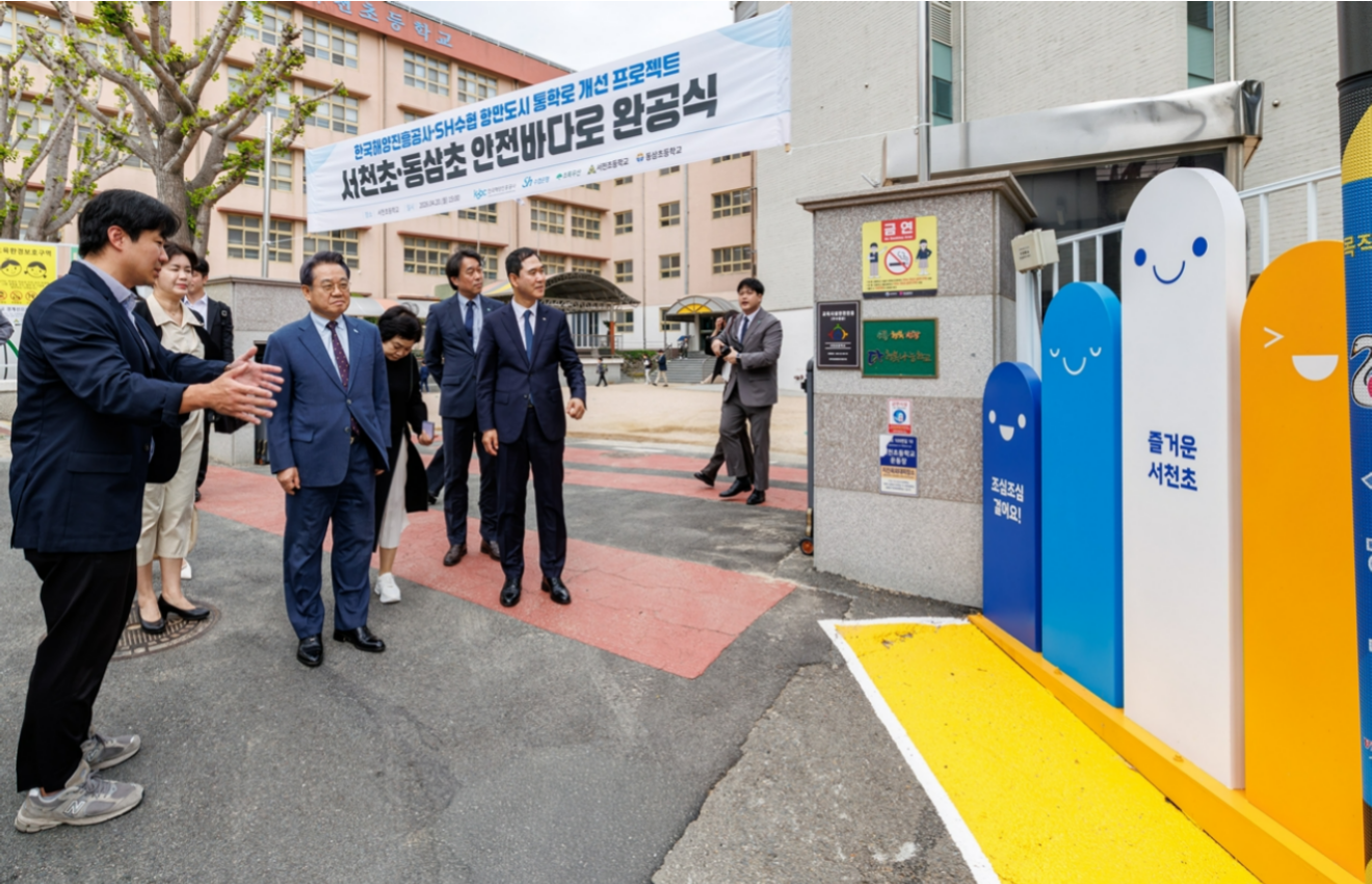 서천초(안전바다로 3길)에는 차도와 인접한 정문에 완충 공간을 만들어 학생들이 등하교 시 안전하게 대기할 수 있도록 했고, 캐릭터형 구조물이 운전자의 시야에 인지되도록 해 자연스러운 속도 감소를 유도했다.