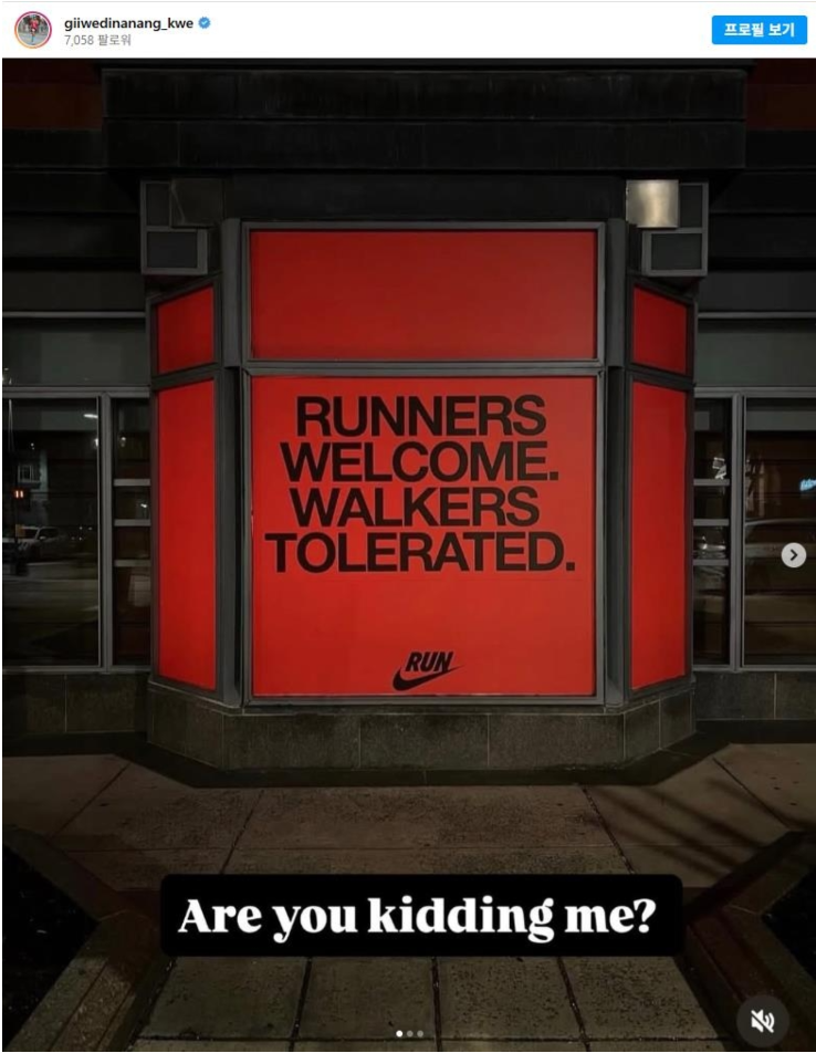 나이키는 최근 미국 매사추세츠주 보스턴 자사 매장 쇼윈도에 '러너는 환영, 워커는 용인'(RUNNERS WELCOME. WALKERS TOLERATED)이라는 대형 간판을 설치했다.