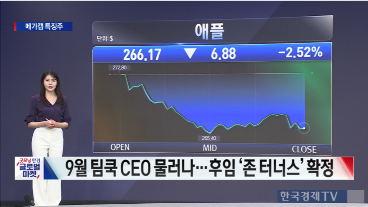 애플이 팀 쿡 최고경영자(CEO)의 퇴진 발표 여파 속에 약세를 이어갔다.