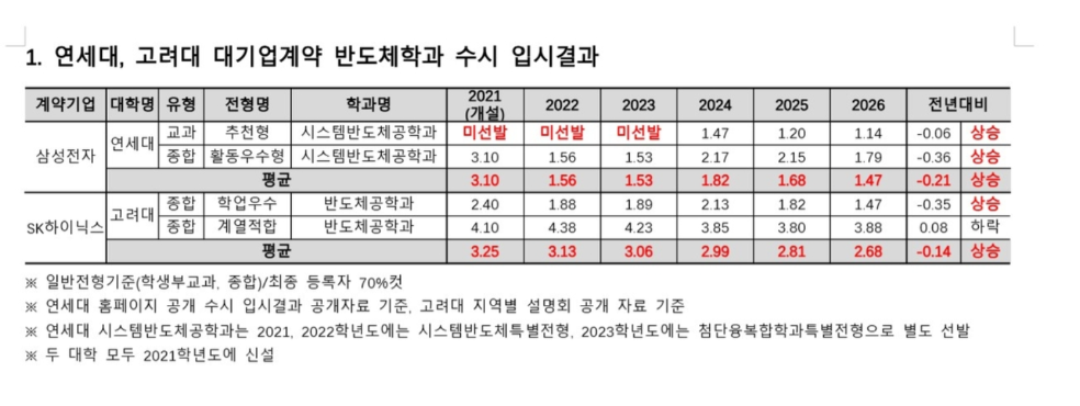 연세대와 고려대 반도체 계약학과의 2026학년도 수시 내신 합격선이 역대 최고 수준으로 올라서면서 최상위권 수험생들의 경쟁이 한층 치열해진 것으로 나타났다. 반도체 산업 호황과 함께 삼성전자, SK하이닉스 등 주요 기업 입사 경쟁이 심화된 영향으로 분석된다.