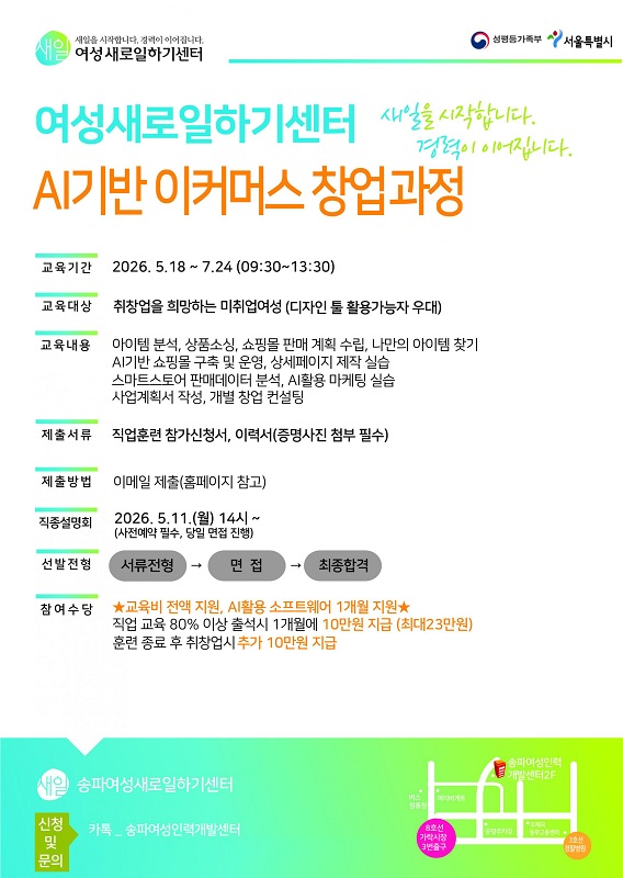 지역 여성들의 창업 성공률을 제고하고 안정적인 비즈니스 기반을 마련하기 위해 송파여성새로일하기센터가 ‘AI 기반 이커머스 창업과정’을 선보인다. 이번 과정은 예비 창업자가 직면하는 아이템 선정의 불확실성과 마케팅의 한계를 AI 기술로 극복하는 데 중점을 둔 특화 교육으로, 전문성과 실무 능력을 겸비한 여성 창업가 육성을 목표로 한다.