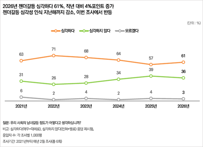 2026년 조사에서 응답자의 61%가 우리 사회 젠더갈등이 심각하다고 답해 전년(57%)보다 4%포인트 증가했다. 2021년 이후 6년간 젠더갈등이 심각하다는 인식은 매년 과반을 유지하고 있다. 향후 전망 역시 부정적이다. ‘지금과 비슷한 수준일 것’이라는 응답이 58%, ‘지금보다 심각해질 것’이라는 응답이 20%로, 응답자 10명 중 8명가량이 현 수준 유지 또는 악화를 예상했다.
