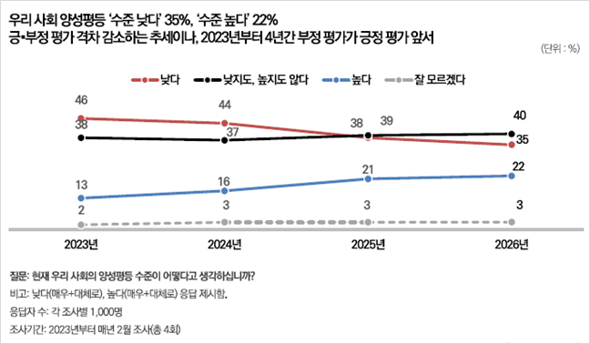 한국리서치 이소연 책임연구원은 “이번 조사에서 젠더갈등이 심각하다는 인식이 다시 증가했고, 양성평등 수준에 대해서도 전반적으로 비관적인 평가가 이어지고 있다”며 “특히 이러한 경향은 청년세대에서 더욱 두드러진다”고 설명했다. 이어 “우리 사회를 특정 성별에만 유리한 구조로 보거나 남녀 중 한쪽을 전반적인 사회적 약자로 인식하는 경향은 크지 않지만, 청년층에서는 남녀 모두 자신이 속한 성별이 더 불리하다고 인식하는 특징이 확인된다”고 밝혔다. “국회·법원 등 공적 주체의 양성평등 실현 노력에 대한 체감도는 낮은 수준에 머물러 있다”며 “이는 갈등 해소를 위한 제도적·정책적 대응에 대한 신뢰가 충분히 형성되지 못하고 있음을 시사한다”고 덧붙였다. “특히 청년층이 체감할 수 있는 공정성과 실효성을 갖춘 정책을 통해 공적 영역에 대한 신뢰를 회복하는 것이 중요하다”고 강조했다.