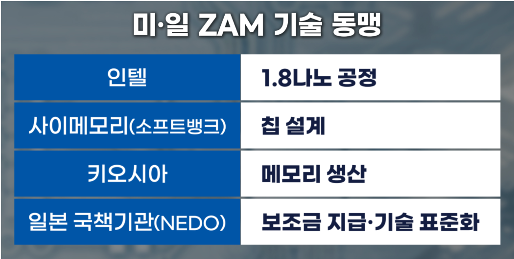일본 반도체가 그동안 한국을 뒤쫓는 형태였다면, 이제는 새로운 생태계를 설계해서 한국의 주도권을 뺏어오겠다는 전략이죠. 그 핵심 병기가 바로 ZAM(Z-Angle Memory)입니다.