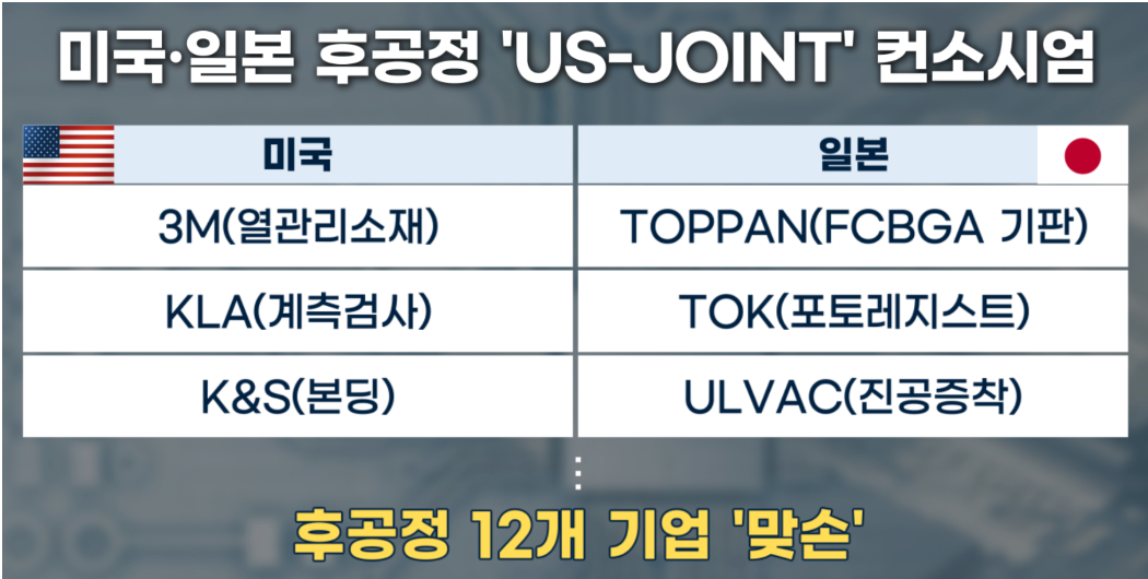 여기에 실리콘밸리에서는 미국과 일본의 소재·부품·장비 기업 12곳이 뭉친 'US-JOINT' 컨소시엄이 출범했습니다. 미국에서는 3M, KLA 같은 기업이 참여하기로 했고요, 일본에서도 TOPPAN(기판), TOK(포토레지스트) 같은 거물급 기업이 동참하기로 했습니다.