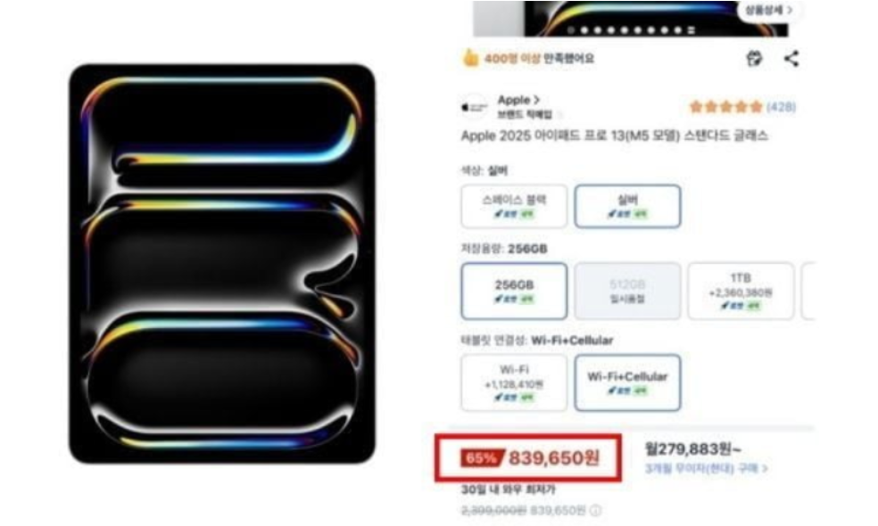29일 업계에 따르면 지난 27일 오후 1시께 쿠팡에 '아이패드 프로 13인치 M5 256GB 와이파이+셀룰러 모델'이 83만9650원에 등록됐다. 해당 제품은 지난해 10월 출시된 모델로 공식 가격이 236만9000원이지만, 당시에는 정가의 3분의 1 수준으로 노출됐다.