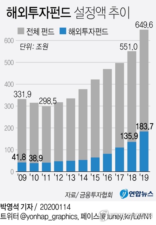 14일 금융투자협회에 따르면 지난해 말 현재 해외투자펀드 설정액은 183조7천억원으로 전체 펀드 설정액의 28.3%에 달했다.