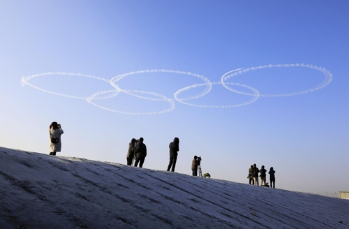 (도쿄=연합뉴스) 박세진 특파원 = 일본 항공자위대 곡예비행팀이 도쿄 올림픽·패럴림픽 관련 행사에서 선보일 예정인 오륜기 그리기에 성공했다.