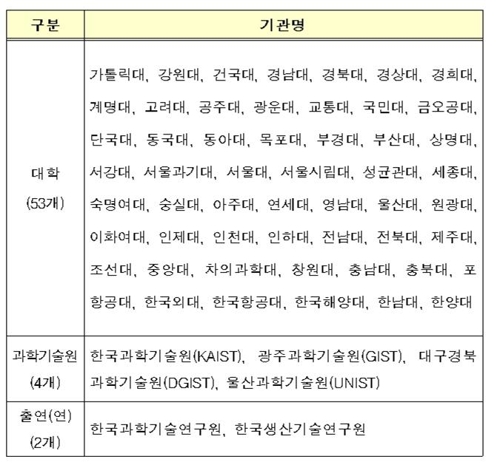 이달 기준 한국과학기술연구원(KIST), 한국생산기술연구원 등 2개 정부 출연연구기관과 대학을 비롯한 59개 기관이 통합관리 기관으로 지정돼 있다. 과기정통부는 각 기관의 규정 마련 여부를 상반기 점검할 예정이다.