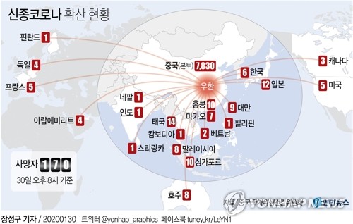 중국 국가위생건강위원회(위건위)는 30일 오후 8시 현재 전국 31개 성에서 '우한 폐렴'의 누적 확진자는 7천830명, 사망자는 170명이라고 발표했다.