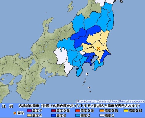 이 지진으로 이바라키현 남부·북부, 도치기(회<又대신 万이 들어간 板>木)현 남부, 사이타마(埼玉)현 북부·남부, 지바(千葉)현 북서부에서 진도 4의 흔들림이 감지됐다.