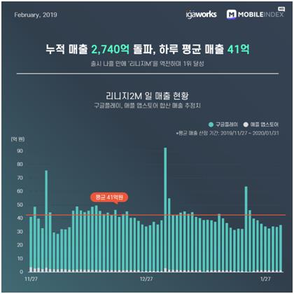 (서울=연합뉴스) 홍지인 기자 = 모바일 빅데이터 플랫폼 기업 아이지에이웍스는 엔씨소프트[036570]의 다중접속임무수행게임(MMORPG) '리니지2M'의 하루 평균 매출이 41억원에 달하는 것으로 추정된다고 10일 밝혔다.