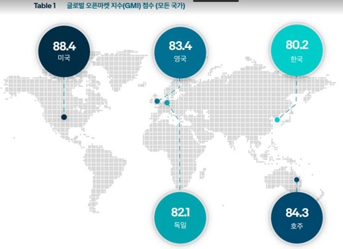 한국의 글로벌 오픈마켓 지수는 100점 만점에 80.2점으로, 보고서에 언급된 미국(88.4), 호주(84.3), 영국(83.4), 독일(82.1)보다 낮았다. 오픈마켓 지수는 오픈마켓 판매가 생활방식에 미치는 영향, 사업 환경, 재정적 안정성 등을 평가해 정해진다.