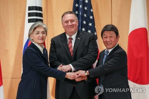 강경화 외교장관, 마이크 폼페이오 미국 국무장관, 모테기 도시미쓰(茂木敏充) 일본 외무상은 뮌헨에서 열린 뮌헨안보회의 기간 3국 외교장관 회담을 별도로 개최했다.