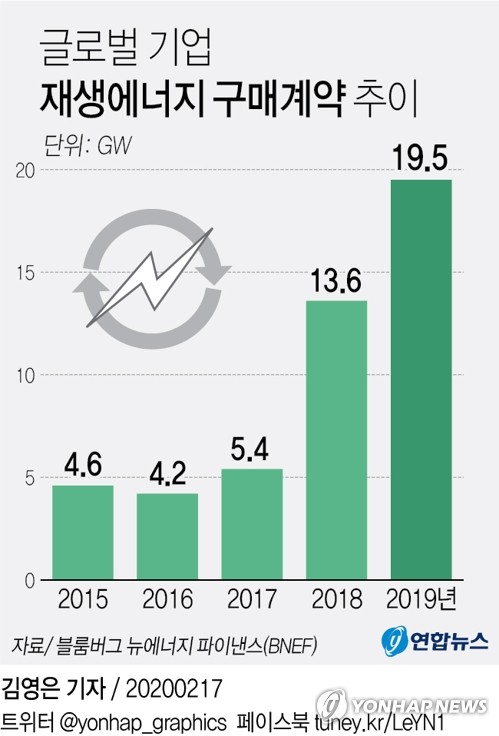 (서울=연합뉴스) 김준억 기자 = 글로벌 기업들의 재생에너지 구매계약이 2년 만에 3배로 급증하는 등 친환경 경영이 확산추세를 보인다.