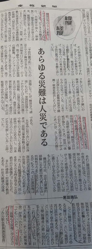 이 신문의 구로다 가쓰히로(黑田勝弘) 서울 주재 객원논설위원은 '모든 재난은 인재다'라는 제목의 칼럼에서 한국은 지금까지 코로나19를 막는 데 성공하고 있다고 글을 시작했다.