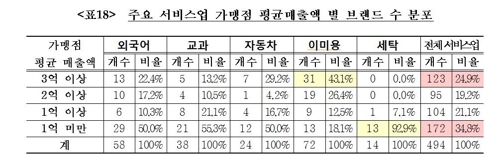서비스 가맹점 중 이미용 업종의 평균 연매출이 3억5천700만원으로 가장 많았고, 자동차 업종(3억2천700만원)이 두 번째였다. 세탁(8천600만원)·외국어(7천800만원)·교과(4천500만원) 등의 매출은 1억원을 밑돌았다.