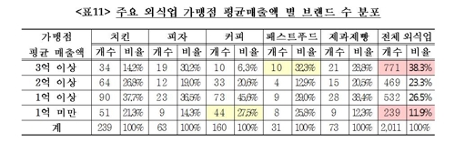 가맹점의 평균 연매출이 3억원 이상인 외식브랜드(771개)는 전체 브랜드의 38.3%를 차지했다. 반면 외식브랜드의 12%에서는 가맹점의 평균 연매출이 1억원 미만이었다. 특히 커피업종의 경우 브랜드의 27.5%에서 가맹점 평균 연매출이 1억원을 밑돌았다.