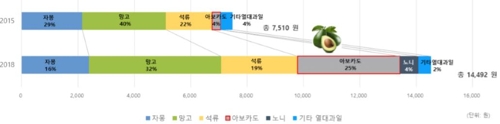 보고서는 "아보카도는 가구당 구매액 비중이 2015년과 비교해 2018년 21%P나 증가해 구매액 기준으로는 10배 이상 뛰었다"며 "같은 기간 자몽과 망고 구매액도 늘어났지만, 전체 파이가 커져 비중은 줄어들었다"고 분석했다.