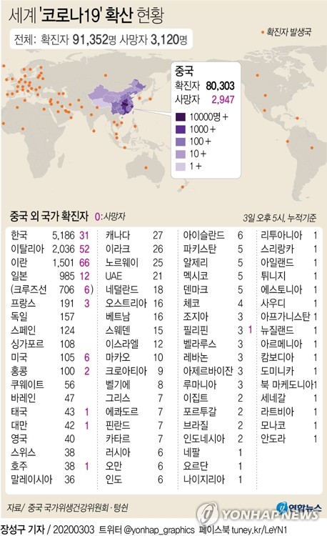 코로나19 환자는 현재 전 세계적으로 9만명을 넘어선 가운데 진원지인 중국 이외 국가들의 확진자 수도 1만명을 넘어섰다.