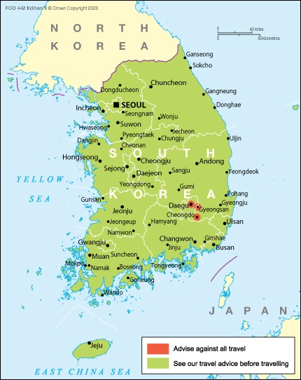 외무부는 "한국 정부가 확진자 증가로 대구, 청도, 경산을 '특별관리구역'으로 지정했다"며, "이미 대구, 청도, 경산에 머무르는 영국 국민은 현지 당국의 지시와 조언을 따르고 바이러스 검사와 통제 대책에도 주의를 기울이라"고 당부했다.