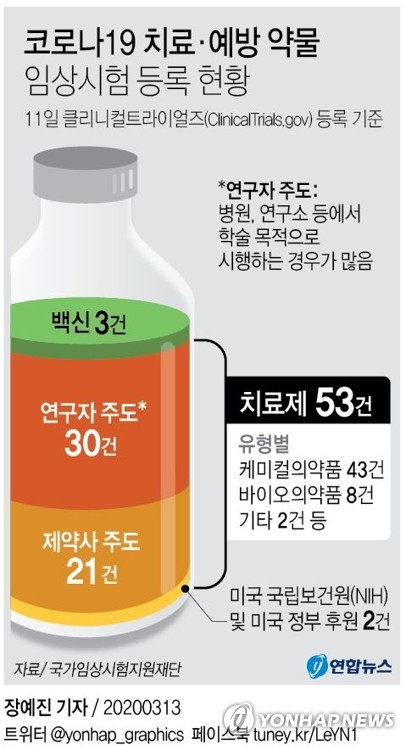 (서울=연합뉴스) 김잔디 기자 = 전 세계에서 신종 코로나바이러스 감염증(코로나19)의 치료와 예방을 위해 총 56건의 약물 중재 임상시험이 진행 중인 것으로 파악됐다.