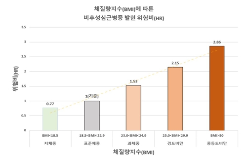 그 결과 과체중, 경도비만, 중등도 이상 비만은 표준체중보다 비후성 심근증 발생위험이 각각 1.5배, 2.2배, 2.9배 높았다.