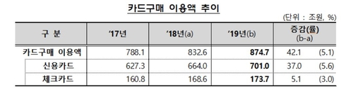 지난해 신용·체크카드 이용액은 874조7천억원으로 1년 전보다 42조1천억원으로 증가, 역대 최고를 기록했다.