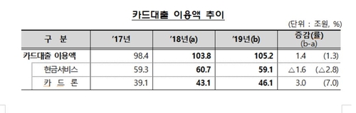 금융감독원이 30일 내놓은 '8개 전업 카드사 영업실적' 자료에 따르면 2019년 카드 대출 이용액은 105조2천억원으로 전년 대비 1조4천억원 증가했다.