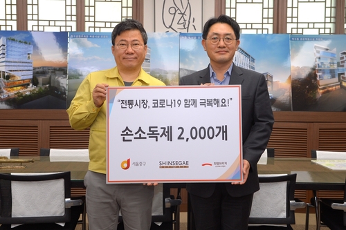 (서울=연합뉴스) 황희경 기자 = 신세계면세점은 서울 중구청과 함께 남대문시장과 명동점 주변 상가 소상공인들에게 손소독제 2천개를 기부했다고 3일 밝혔다.