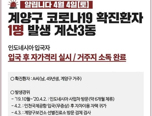 A씨는 무증상 상태로 입국한 뒤 3일 계양구보건소에서 검사받았고, 이날 양성 판정이 나왔다.