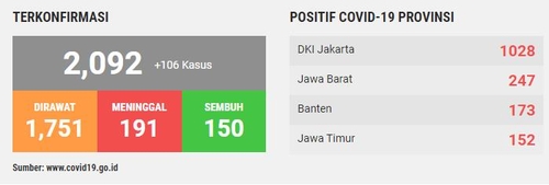 (자카르타·인천=연합뉴스) 성혜미 특파원 최은지 기자 = 인도네시아의 신종 코로나바이러스 감염증(코로나19) 확진자가 4일 106명 추가돼 모두 2천92명으로 늘었다.