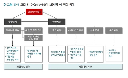 코로나19 사태로 주가와 신용스프레드, 환율 등의 변동성이 확대되고 그에 따라 금리 인하가 이어지면서 보험회사의 자산과 부채에도 부정적인 영향이 발생한다.