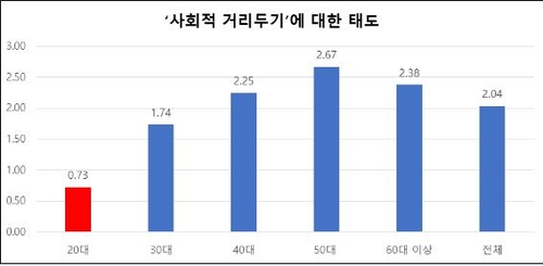 당시 조사 결과에서 20대 마스크 착용률은 88.7%로 전체 평균과 유사하지만, '외출 자제'를 '자주' '항상' 한다는 20대 응답자는 78.5%로 전체(73.4%)보다 많았다.