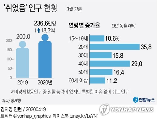 (세종=연합뉴스) 정책팀 = 신종 코로나바이러스 감염증(코로나19) 고용 쇼크가 현실화한 지난달 구직활동 계획이 없어서 '그냥 쉬었다'고 답한 사람이 237만명에 육박하며 통계 작성 후 최대 수준을 기록했다.