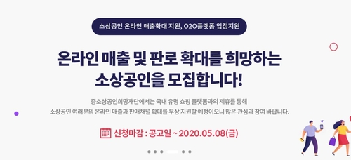 ▲ 재단법인 중소상공인희망재단은 다음 달 8일까지 온라인 판로 지원 사업에 참여할 소상공인을 모집한다고 19일 밝혔다. 참여 소상공인에게는 G마켓, 위메프 등 오픈마켓과 O2O(온라인·오프라인 연계) 쇼핑몰에 입점할 기회를 주고 광고·마케팅을 지원한다. 자세한 사항은 재단 홈페이지에서 확인할 수 있다. (서울=연합뉴스)