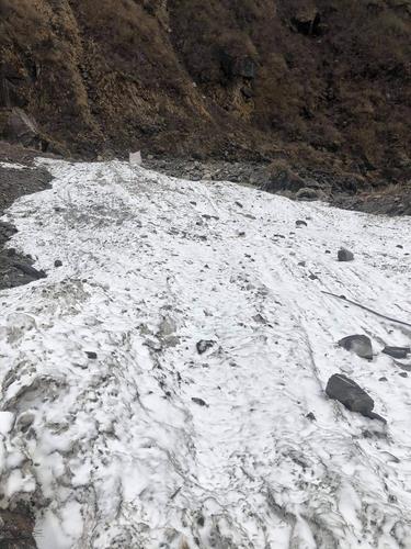 사고는 산과 계곡 사이로 구불구불 이어지는 좁은 길에서 발생했고, 눈사태로 발생한 눈과 얼음이 길가 계곡 아래까지 밀고 내려간 상태였다.