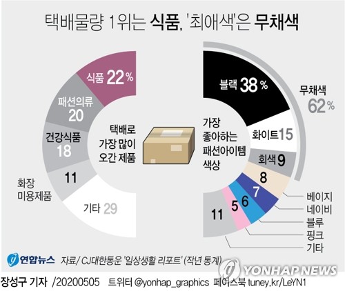 (서울=연합뉴스) 이신영 기자 = 지난해 택배로 가장 많이 오간 제품은 식품이었고, 우리나라 사람들이 가장 좋아하는 패션 아이템 색상은 무채색이었다.
