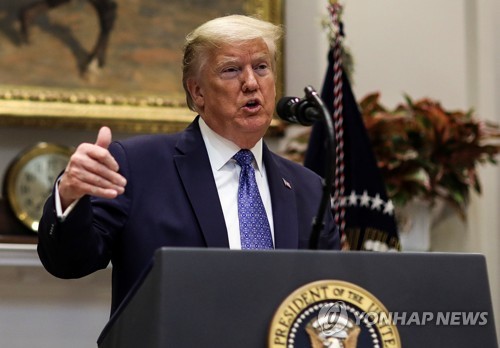 (워싱턴=연합뉴스) 송수경 특파원 = 도널드 트럼프 미국 대통령은 19일(현지시간) 소 수입 관련 무역 합의를 폐기하는 방안을 검토할 것이라고 밝혔다.