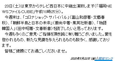 이시바 전 간사장은 22일 저녁 자신의 블로그에서 이번 주말에는 '코로나 쇼크·서바이벌', '한반도와 일본의 미래', '이야기 한국인'을 읽으려고 한다고 밝혔다.