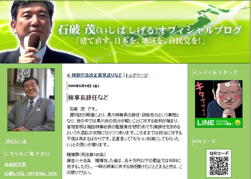 이시바 전 간사장의 이날 블로그 게시글은 상당 부분 구로카와 전 검사장의 '마작스캔들'에 대한 아베 내각의 대응을 비판하는 내용이었다.