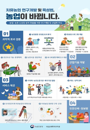 (세종=연합뉴스) 고은지 기자 = 농촌진흥청이 '치유농업'을 새로운 성장동력으로 육성하기 위해 과학적 효과가 검증된 프로그램을 개발하고 서비스 모델을 발굴한다.