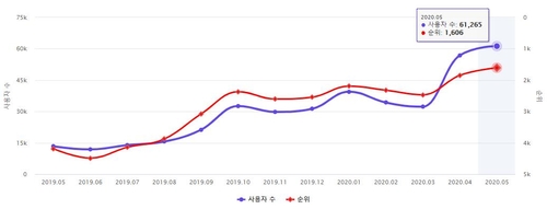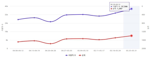 '씽씽' 주간 이용자도 5월 초·중순까지 2만5천명대에서 정체했다가, 5월 셋째 주 이후 3만명을 넘겨 마지막 주에 3만3천명까지 늘어났다.